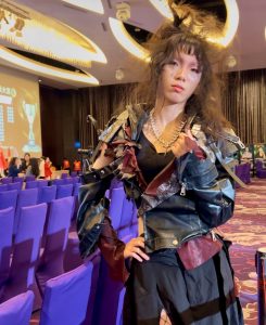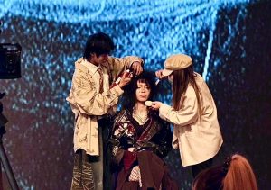 負責彩妝的林芳存說,一開始是朝個性、金屬風設計妝感,想要搭配鉚釘、迴紋針等異材質,後來發現與蛇紋服裝不易搭配,改去找能呈現蛇紋的網狀材質,拓印在臉妝上,搭配擔任模特兒的大二學妹張哲芸個性化五官,終於能完美呼應服裝、髮型,非常感謝模特兒一再配合試妝。