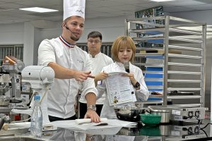 弘光科技大學邀請法國雷諾特廚藝學院到校辦說明會暨示範課程,讓國際餐旅學院學生了解前往學院海外實習與國際交流機會,並由2023年獲法國總統授予「法國最佳工匠MOF」殊榮的明星講師 Pierre-Henri Roullard(皮耶.亨利 胡拉),示範巧克力香草爆米花塔、黑森林蛋糕。學生說,大師運用創新技法將日常零嘴爆米花升級為高級甜點,令人驚艷,也獲得許多啟發。
